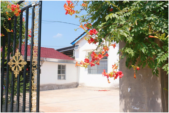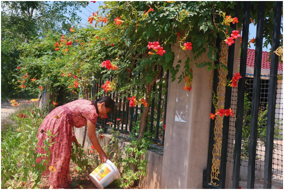 红瓦粉墙,花团锦簇。手腕粗的花树顺着篱笆攀援而上,密密麻麻开满了各色艳丽的小花,章友福和老伴就住在这片花的海洋里。“村里发动群众建设美丽乡村,我们首先要把自己的庭院打扫干净,收拾漂亮点儿。”章友福一边给花草浇水,一边热情地给大伙介绍,“这种开红花的叫凌霄,这种粉色的叫万寿菊。我们家种花已经好多年了,去年还被村里评为‘最美庭院’了呢。”