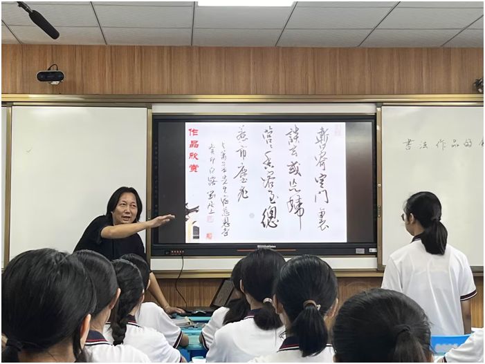 刘居上老师执教的内容是《书法作品的创作》,他从激情导入、作品欣赏引入课题,围绕书法作品的三要素和书法作品创作三步走两大环节步步展开,顺着初次试写、教师示范、观摩再写的教学流程,精彩示范、生动讲解、巧妙点拨,讲练结合,以美育情,让学生掌握书法作品创作的方法和书写要领,感受书法韵味之美。