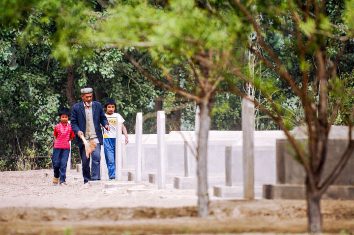 ↑退役军人艾买尔·依提生前带着两个孙子在新疆叶城烈士陵园扫墓(2011年4月30日摄)。新华社记者 江文耀 摄