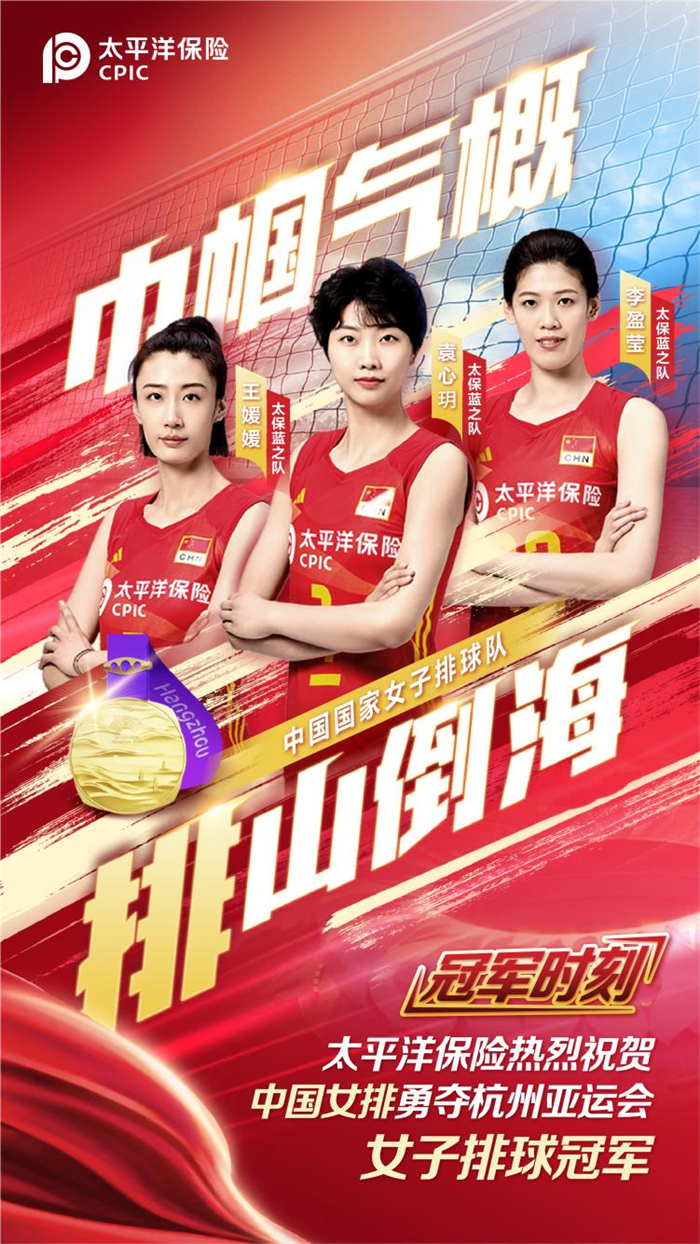 一直以来,中国太保总是在中国女排背后默默守护;“祖国至上、顽强拼搏、团结协作、永不言弃”的女排精神,已内化为中国太保的品牌基因,激励着全体太保人做深做实“太保服务”。无论何时何地,中国太保将倾尽全力支持中国女排,一如既往践行责任、智慧、温度的太保服务,凝心聚力为精彩亚运贡献太保智慧和力量。