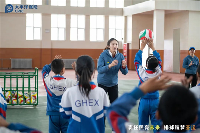 2023年5月,中国太保走进青海省共和县第二寄宿制小学开展“责任照亮未来、排球筑梦亚运”主题活动。中国女排队员丁霞现身活动现场,教学生们从颠球、发球到接球的标准动作。