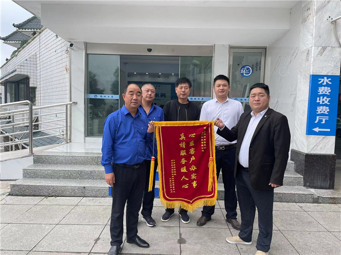 近日,上海新里程物业绿地随州城际空间站物业服务中心负责人,把一面写有“心系用户办实事、真情服务暖人心”的锦旗,交到随州水务集团城市供水公司工作人员手中,对供水公司心系用户、主动上门为用户服务的举措表示深深的感谢。