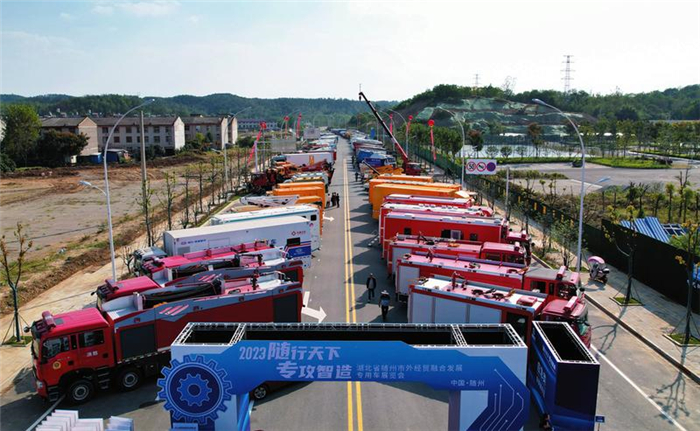 10月11日,2023年湖北省随州市外经贸融合发展专用车展览会在随城星光大道布展完成,来自33家专汽企业的157辆车分为物流类、环卫类、应急类、文旅类、危化品类5大类参与展览展示。 (随州日报全媒记者徐斌摄)