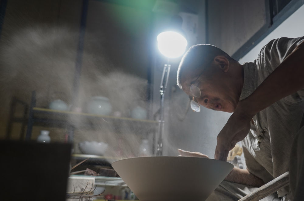 ↑ 2020年12月23日,手工陶瓷制作者在工作室检测成品。