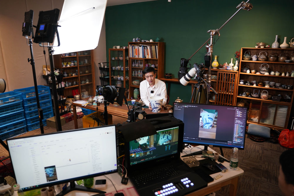 ↑在景德镇,工作人员通过网络直播推介陶瓷产品(2023年2月22日摄)。