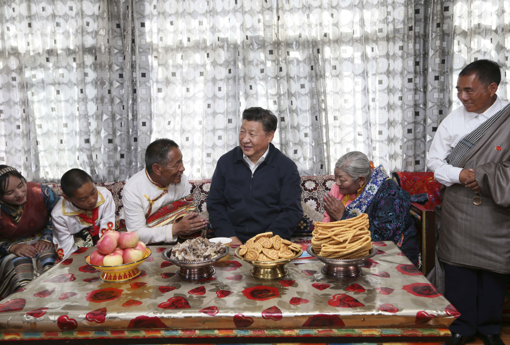 2016年8月22日,习近平在青海海西蒙古族藏族自治州格尔木市唐古拉山镇长江源村藏族村民申格家中同一家人亲切交谈。