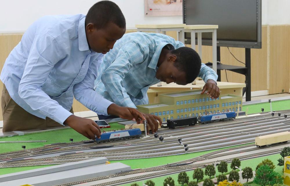 △2022年9月19日,在位于吉布提首都吉布提市的工商学校,学生在鲁班工坊铁道运营沙盘教学区学习。