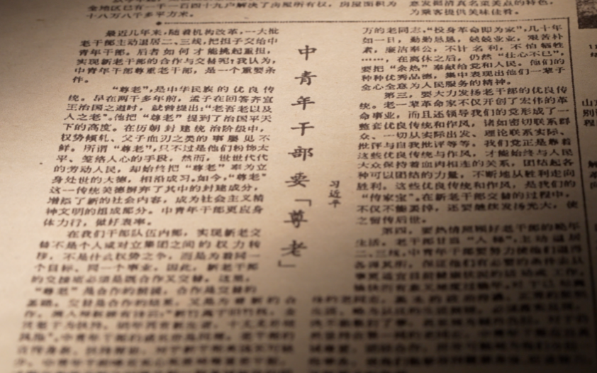 1984年12月7日,《人民日报》第4版上发表了一篇评论——《中青年干部要“尊老”》,作者是时任河北正定县委书记习近平。在论述“尊老”传统美德时,文章引经据典,包括孟子的“老吾老以及人之老”等。全文篇幅不长,却真实反映了习近平尊老敬老的深情厚意。