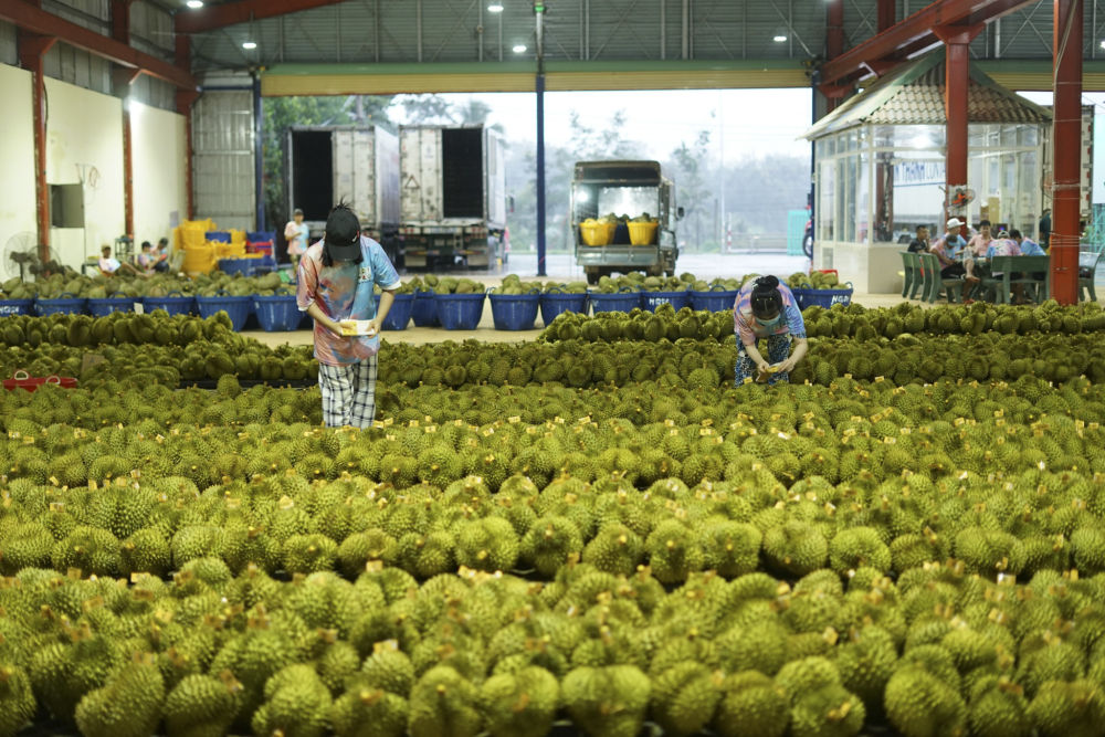 2023年9月15日,在越南多乐省一家榴莲加工厂,工人在给即将出口到中国的榴莲包装贴牌。随着《区域全面经济伙伴关系协定》红利释放,中国—东盟贸易规模进一步扩大。越来越多东盟国家的优质水果便捷地进入中国市场,走上消费者的餐桌。