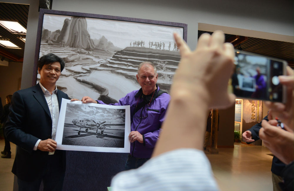 2018年10月25日,在衢州访问的美国雷德温市摄影家向纪念馆捐赠他拍摄的杜立特突袭行动同型轰炸机照片。(王飞 摄)