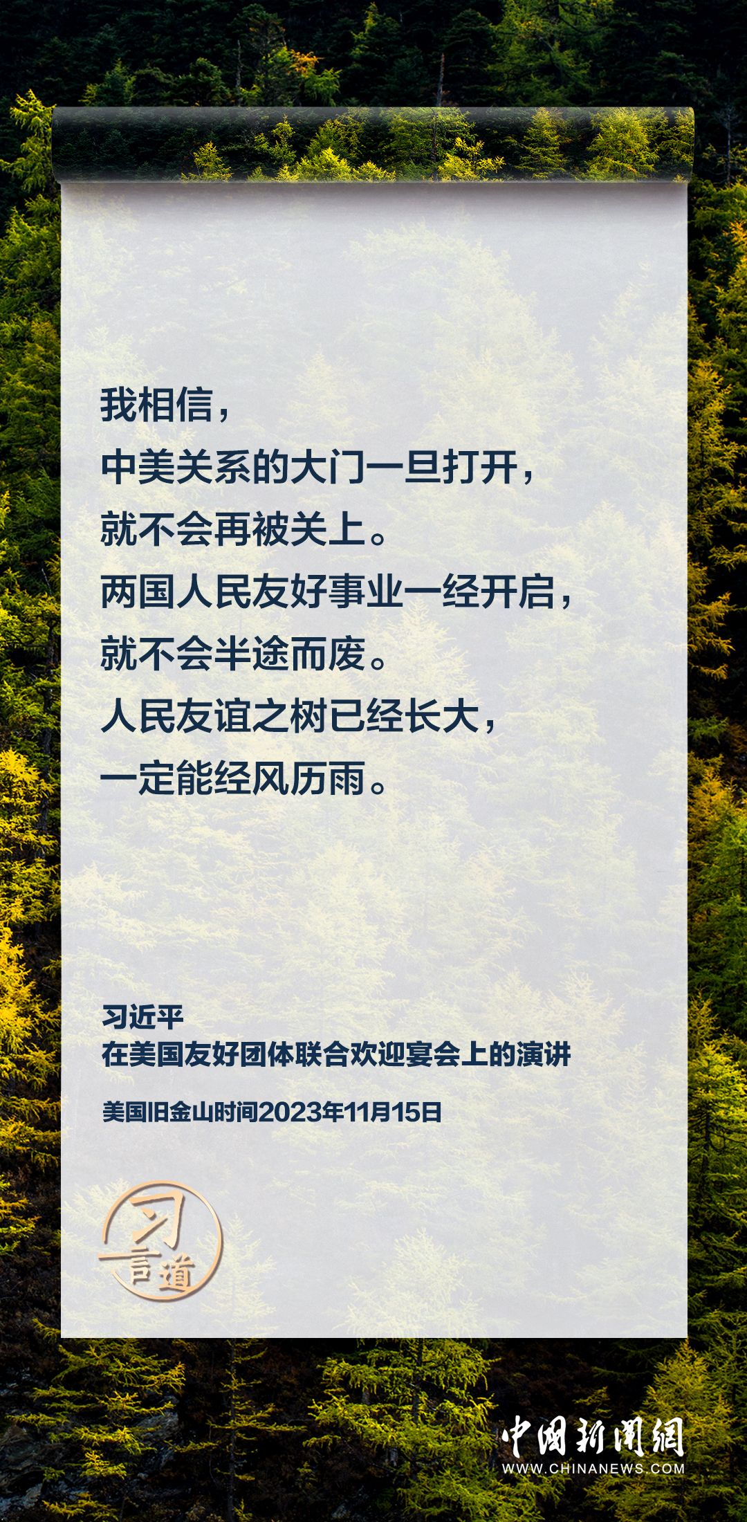 当地时间11月15日,中国国家主席习近平在美国旧金山出席美国友好团体联合欢迎宴会并发表演讲。习近平在演讲中从“我”和“我们”说起,提出中国主张、表明中国立场、展现大国担当,话语掷地有声。