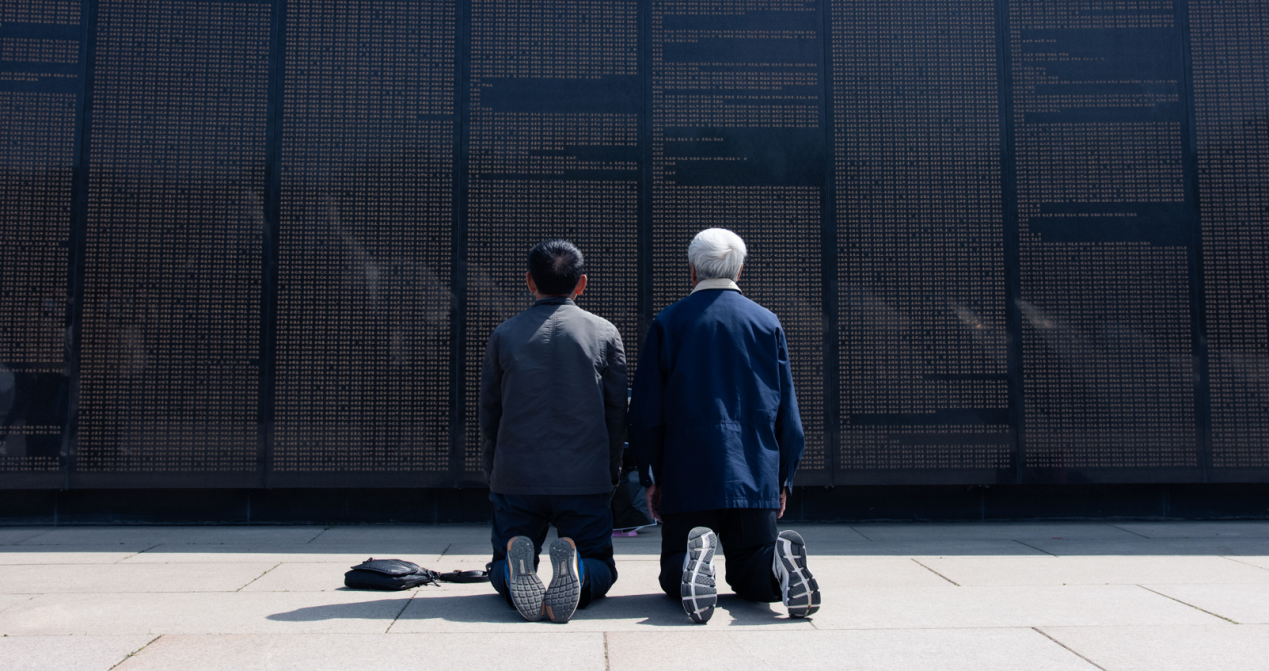 金伍星、金云星兄弟俩跪在补刻父亲名字后的烈士英名墙下。人民网记者 邱宇哲摄