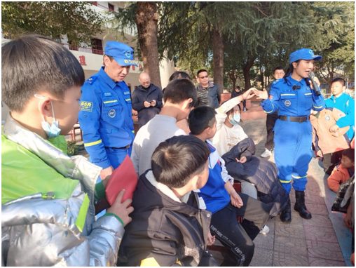 授牌仪式结束后,来自武汉蓝天救援队卢源峰、万斌两位队员为孩子们带来了一堂生动的安全教育课,现场示范了创伤止血包扎方法,并指导学生进行现场实操演练。随后,分小组互动,学生们轮流扮演伤者和急救者,亲身体验创伤止血包扎的过程,老师进行指导和纠正,确保学生们掌握正确的急救技巧。
