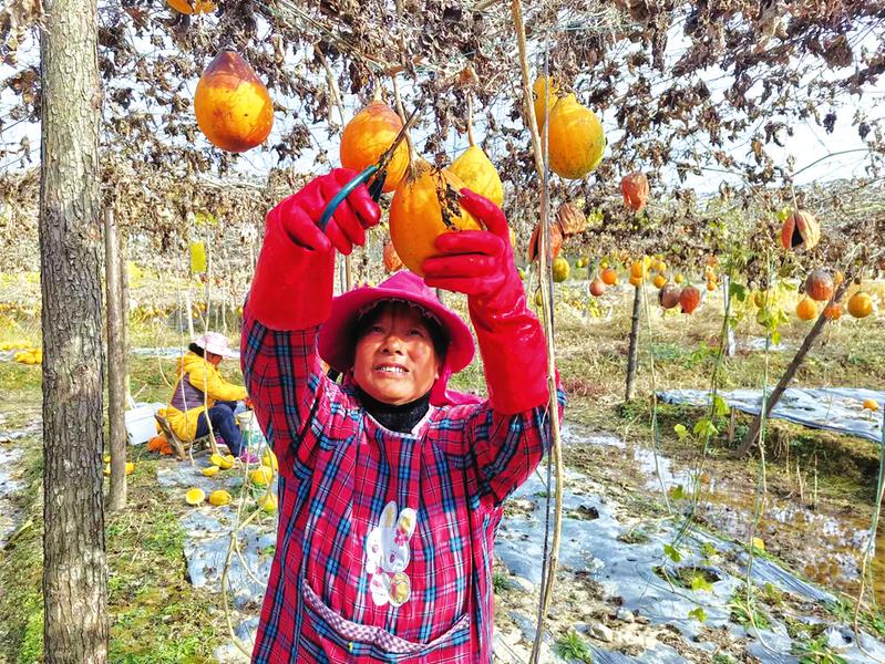 基地里,十几个村民正在忙着采摘瓜蒌果。50多岁的陈秀芳经常到基地做工,瞅准成熟的果子,她拿着剪刀对着瓜蒂快速剪下,不一会儿,地上就堆了一大堆。“村里建了这个基地,我们在家的人可以到这里就近务工,既能照顾家庭,又增加了一笔收入,这个项目好!”她高兴地说。