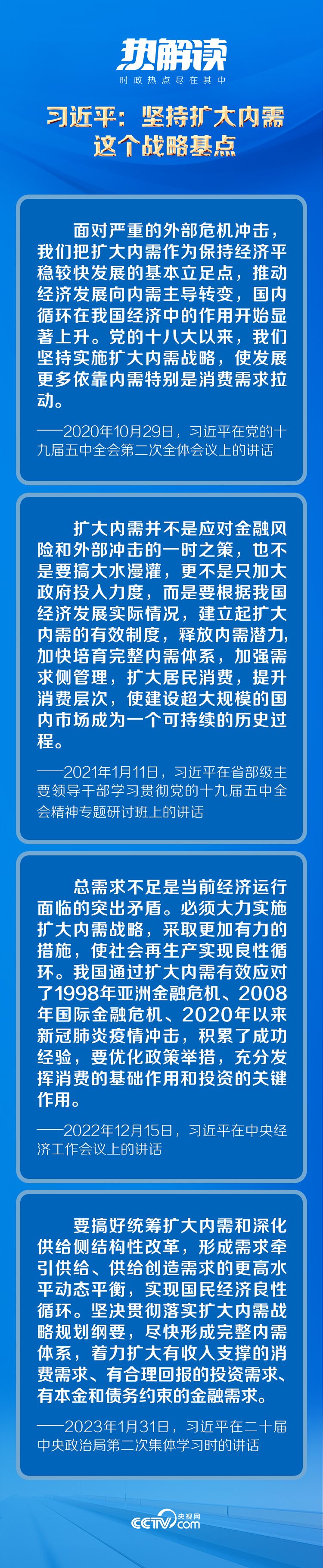 扩大内需是打通经济循环“堵点”、夯实国内基本盘、构建新发展格局的关键支撑,也是充分发挥我国超大规模市场优势的“主动选择”。2023年中央经济工作会议要求,“切实增强做好经济工作的责任感使命感,抓住一切有利时机,利用一切有利条件,看准了就抓紧干,能多干就多干一些,努力以自身工作的确定性应对形势变化的不确定性”。