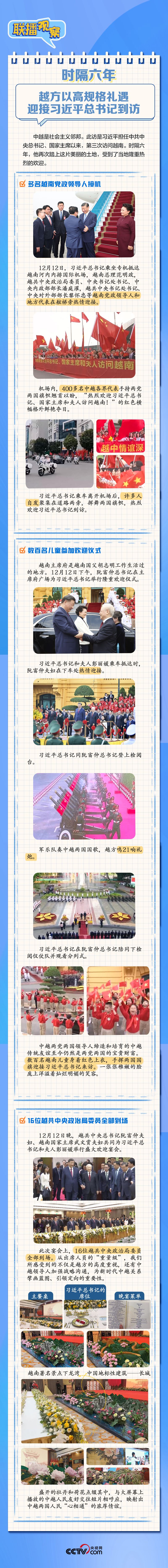 多名越南党政领导人接机、中越各界代表手持两党两国旗帜夹道欢迎、16位越共中央政治局委员全部到场参加欢迎宴会……访越期间,习近平总书记受到越方高规格热情接待,点滴细节见证两国“同志加兄弟”情谊。