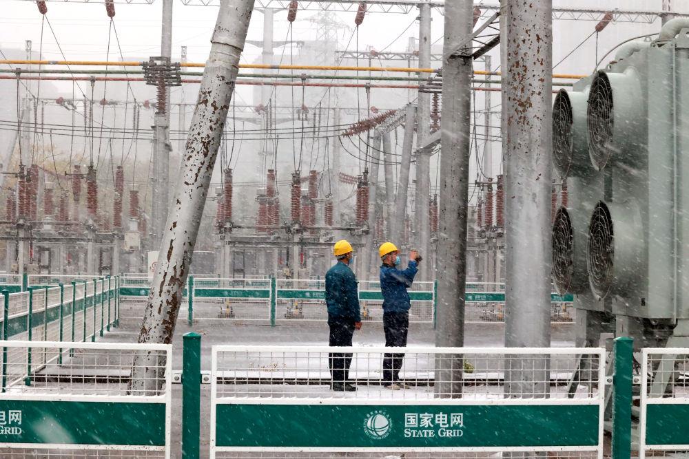 △国网寿光市供电公司变电运维人员在检查变电站积雪情况。