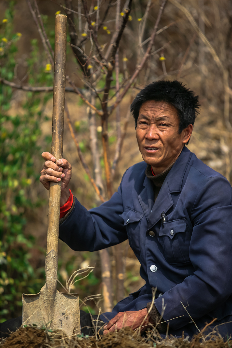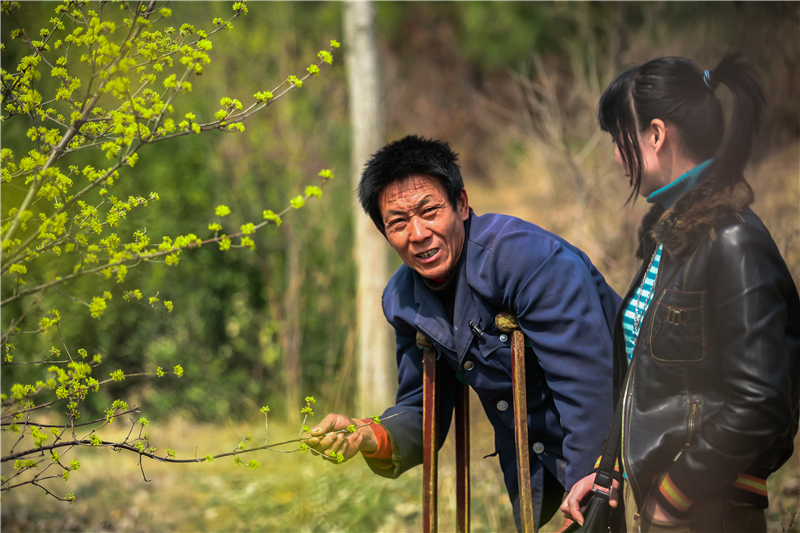 春天,看见自己栽下的树发芽了,付本发非常开心。拍摄于2008年。