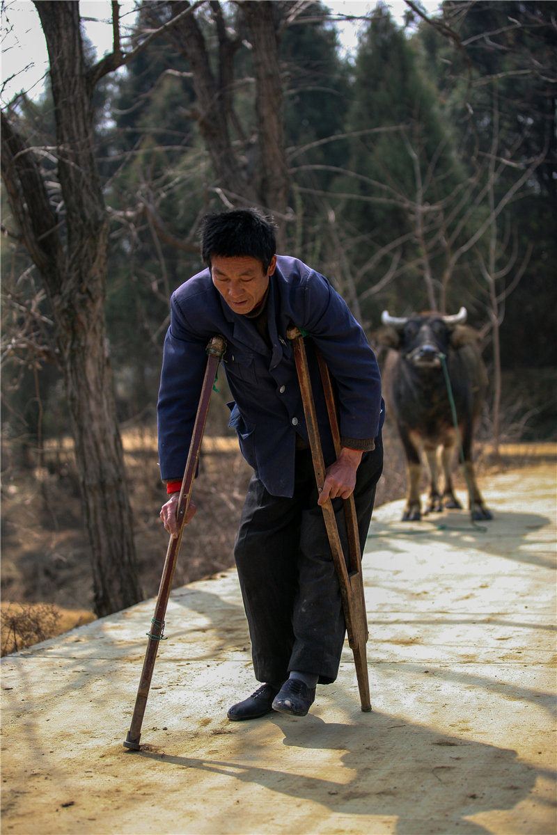 付本发拄着拐杖,拖着自己残障的身体上山种树,个中艰辛只有他自己才知道。拍摄于2008年。