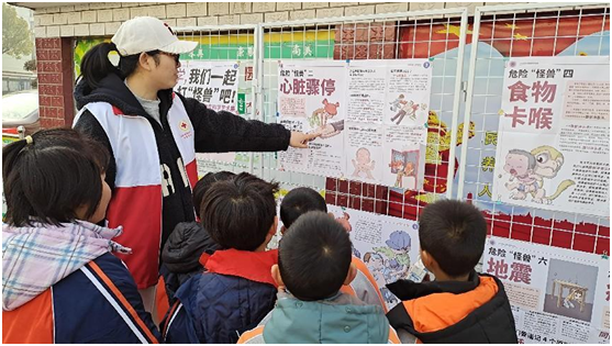 志愿者分年级组织学生观看海报,并进行了详细的讲解。海报共8个板块,以学生感兴趣的方式,在模拟打怪兽的过程中将溺水、中暑、烫伤、割伤、癫痫、地震、流鼻血、食物卡喉、交通事故、心脏骤停等急救知识融入其中,让学生在快乐中学习,有效的提升了学生风险识别和自救互救的能力。