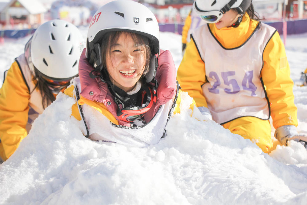 孩子们在西岭雪山滑雪场玩雪。(吕辉 摄)