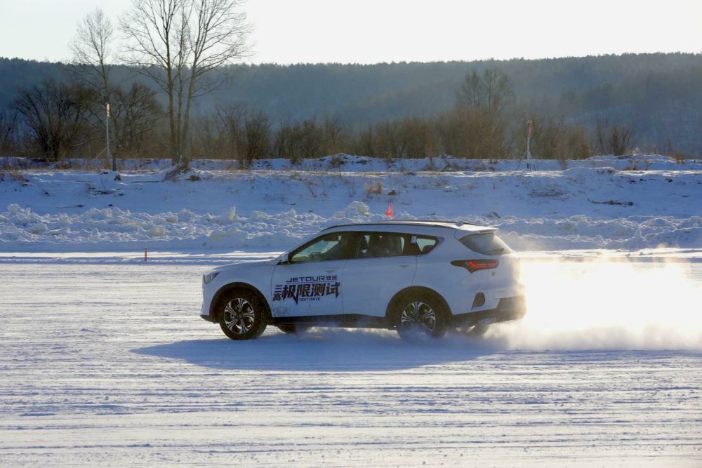 2万多平方米的漠河红河谷寒地试车基地内,形态多样的冰雪路面上,雪雾弥漫,马达轰鸣,灯光闪烁,加速、转弯、急停、漂移……试车人员进行着一系列“炫酷操作”,冰雪飞扬的场地留下一串飘逸的车影。