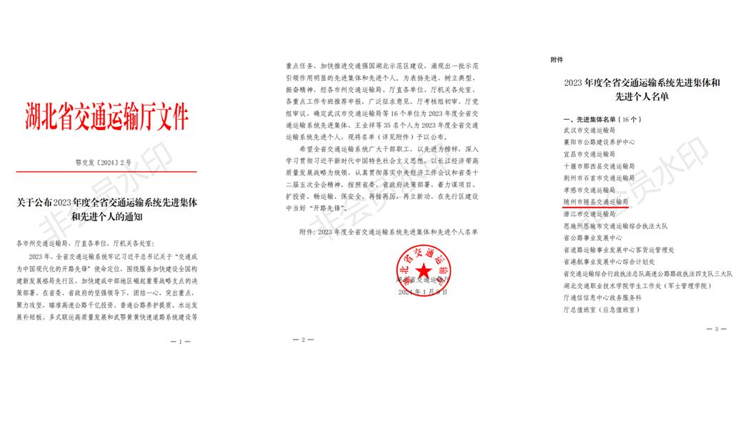 随州新闻网讯(通讯员:向艾、黄璐)近日,湖北省交通运输厅下发《关于公布2023年度全省交通运输系统先进集体和先进个人的通知》,随县交通运输局荣获“2023年度全省交通运输系统先进集体”荣誉称号。