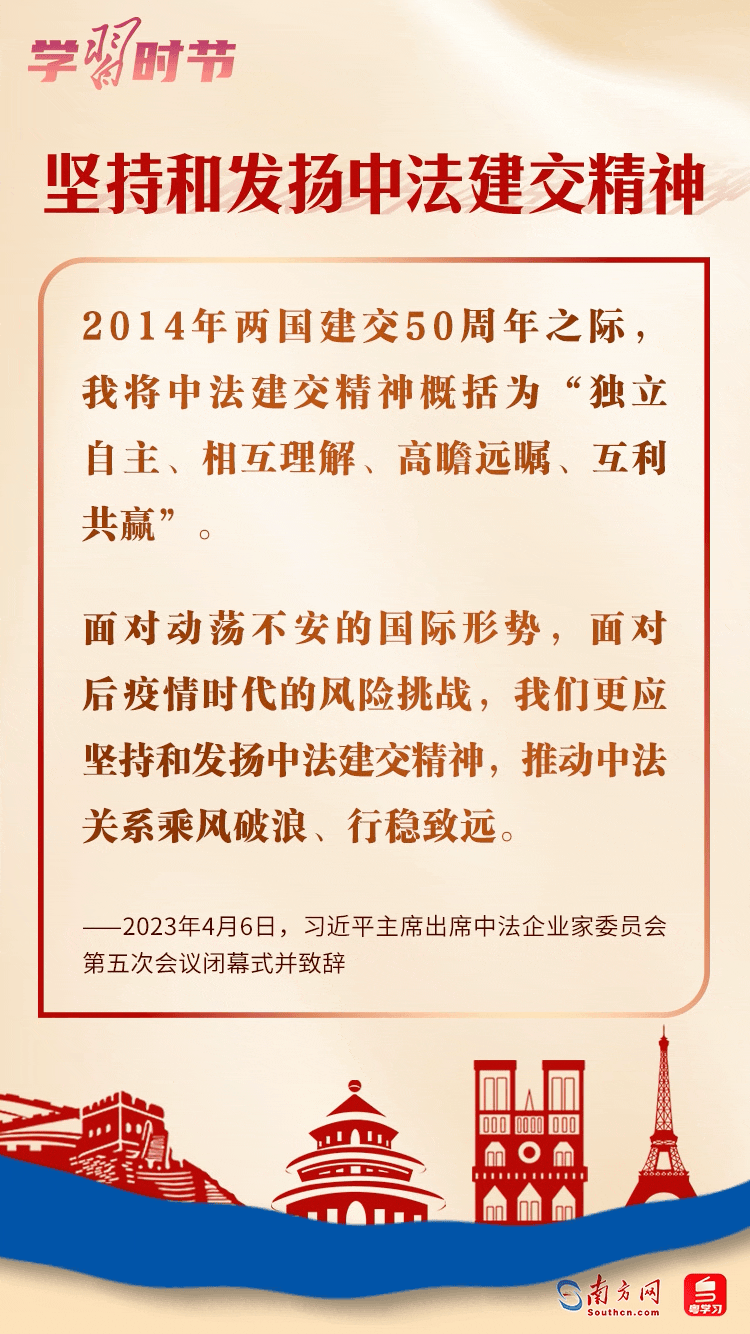 法国是第一个同中国建立正式外交关系的西方大国,“独立自主、相互理解、高瞻远瞩、互利共赢”的中法建交精神引领两国关系始终走在中国与西方大国关系前列。历经60年风雨,中法两国将继续秉持独立自主精神屹立于世界大国之林,将继续以成熟稳健的双边关系为动荡不安的世界提供更多的稳定性。