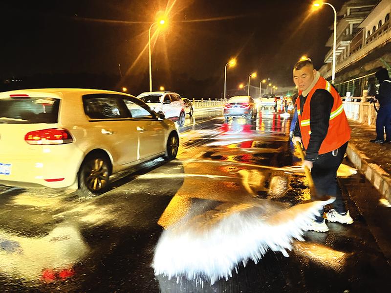 2月1日晚,市市容环卫服务中心在舜井大桥上撒盐,防止桥面结冰。 (随州日报全媒记者王聪莹摄)