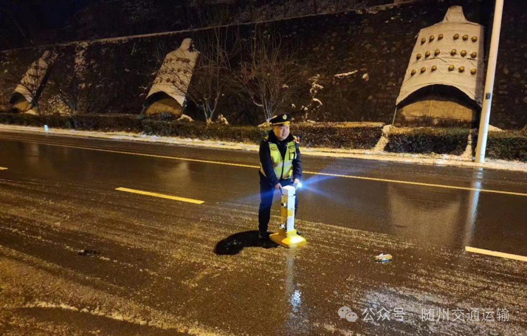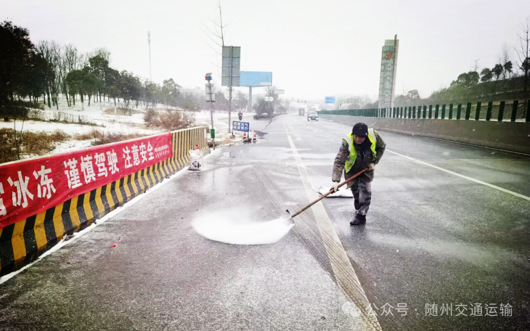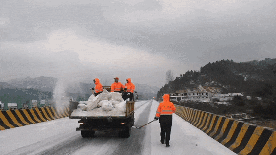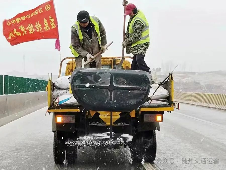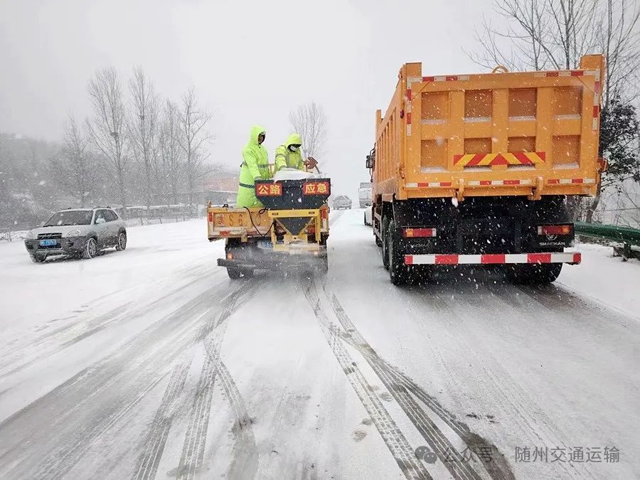 2月1日,广水公路部门组织各养护站养护人员和机械冒着严寒雨雪,第一时间奔赴国省干线和平靖关、武胜关等重点路段一线,根据天气和路况实时情况及时抛撒融雪剂。