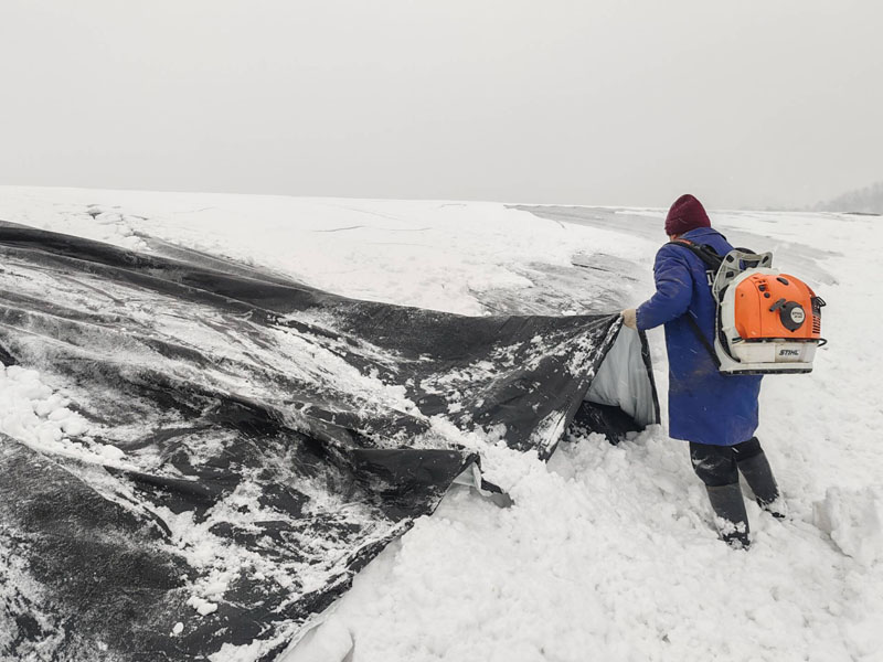 在均川镇光河村,村党支部书记贺合平带领热心群众组成助农除雪服务队,为村里100多个蔬菜大棚扫雪减负。单薄的棚膜已经被厚厚的积雪压得直不起腰来,大家小心翼翼地爬上棚顶,用耙子、扫帚挨个把积雪清理干净。“棚里的青茄正处于采摘期,要是被大雪压垮了,损失不可估量。这些蔬菜大棚,一个投资十几万,可是咱种植户的命根子呢。”贺合平说。