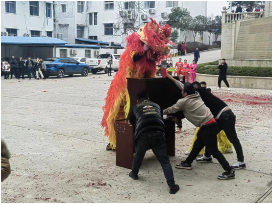 第三个节目为醒狮表演,两位表演者穿上醒狮服,将布狮子披在身上,现场观众抛出零食、红包等,狮子腾空而起,在空中将零食接住,逗得现场观众捧腹大笑。上台阶,登龙梯等高难度动作让观众大开眼界。雄狮登顶也预示吴山镇新一年各项工作再上新台阶。