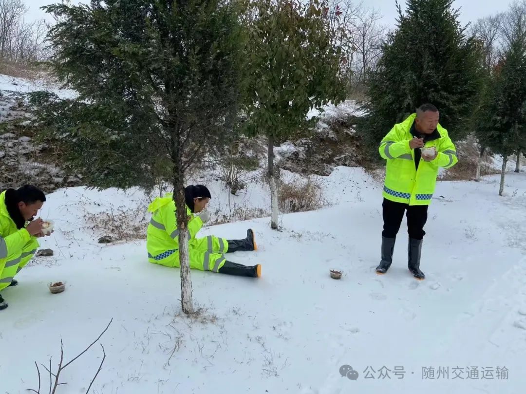 ▲曾都公路工作人员就地坐在雪地上就餐