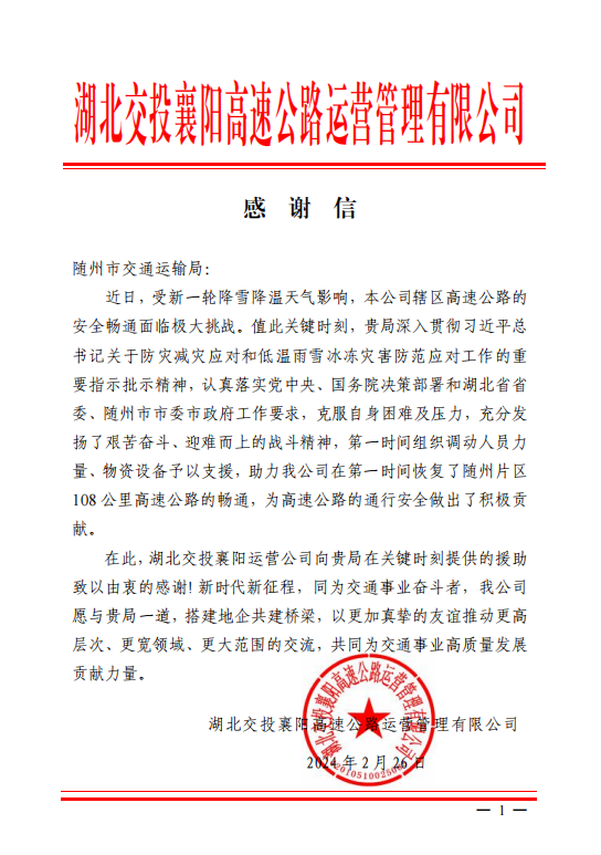 ▲2月27日,湖北楚天智能交通股份有限公司给随州市交通运输局送来了感谢信