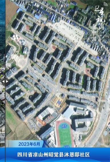 左右滑动切换卫星图-实景图。位于四川省凉山州昭觉县城的沐恩邸社区是“悬崖村”村民搬迁后聚居较多的社区。搬迁后,村民子女上学、县城就医、文化活动等生活需求得到有力保障,生活质量有了显著提升。