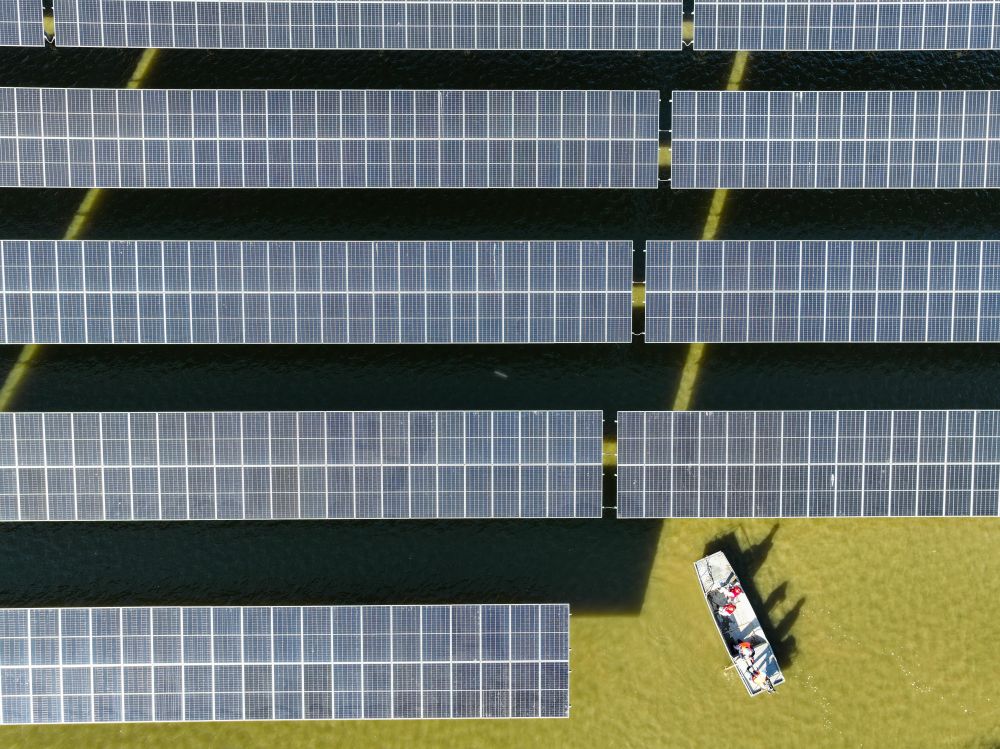 2023年11月17日,在江苏省连云港市灌云县圩丰镇洋桥村,国网连云港供电公司员工对渔光互补发电项目进行巡检(无人机照片)。近年来,连云港市积极践行生态优先、绿色发展理念,依托地理优势和丰富的光照条件,构建清洁低碳、安全高效的新型能源体系,大力发展光伏、风能等清洁能源,助力绿色低碳发展。
