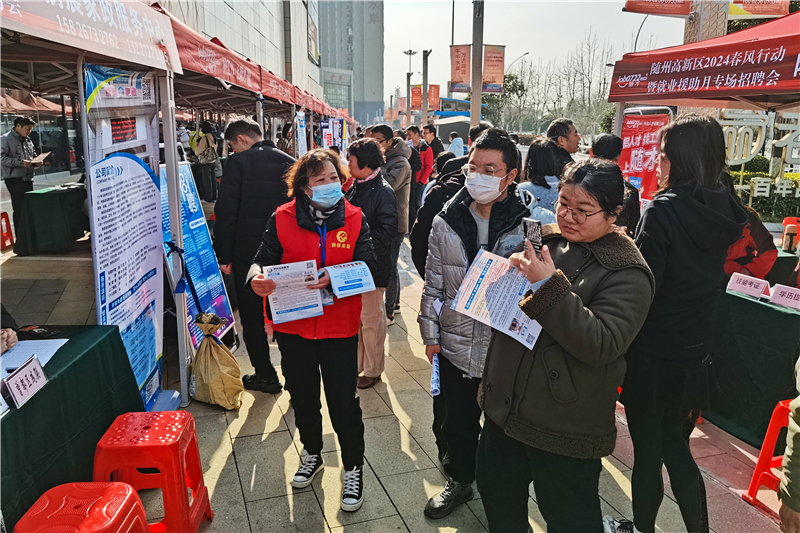 随州高新区2024春风行动暨就业援助月专场招聘会3月9日在万达广场举行。活动现场吸引了众多市民来此咨询就业政策。(全媒记者 孙洪涛摄)