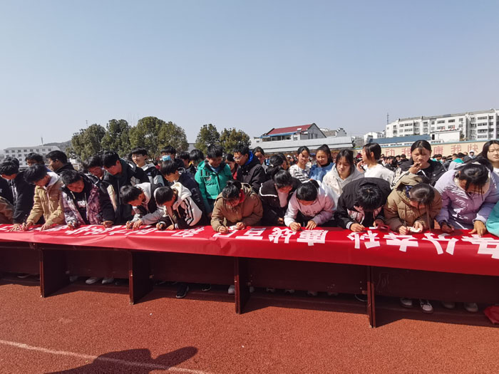 由校长和分管教学副校长一起揭示中考100天倒计时牌,并为各班班长分发中考倒计时计时牌,最后,九年级全体同学在各班励志标语横幅上庄严签名,亮明了自己冲刺中考的"军令状"。