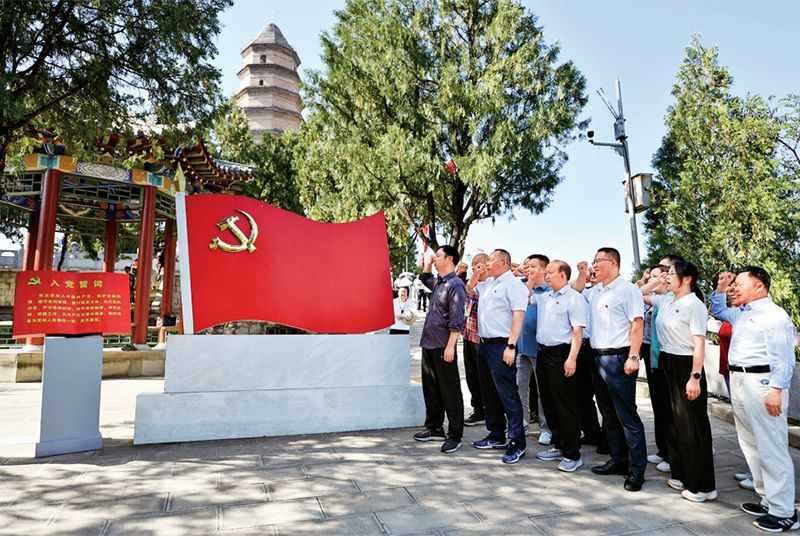在学习贯彻习近平新时代中国特色社会主义思想主题教育中,全党紧扣“学思想、强党性、重实践、建新功”总要求,聚焦主题主线,明确目标任务,突出以学铸魂、以学增智、以学正风、以学促干,与做好开局之年工作紧密结合,特别是着力解决制约高质量发展问题、群众急难愁盼问题、党的建设突出问题,达到预期目的,取得明显成效。图为2023年6月30日,在延安宝塔山参观的党员干部重温入党誓词。 新华社记者 张博文/摄