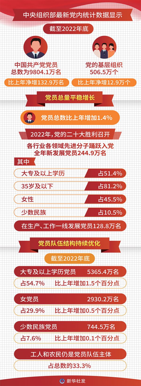 中央组织部2023年6月发布的《中国共产党党内统计公报》显示:截至2022年底,中国共产党党员总数为9804.1万名,比2021年底净增132.9万名。党的基层组织506.5万个,比2021年底净增12.9万个。历经百年风雨和新时代十年革命性锻造,中国共产党更加坚强有力、更加充满活力,党的组织体系日益严密,党的执政根基不断巩固。 新华社发
