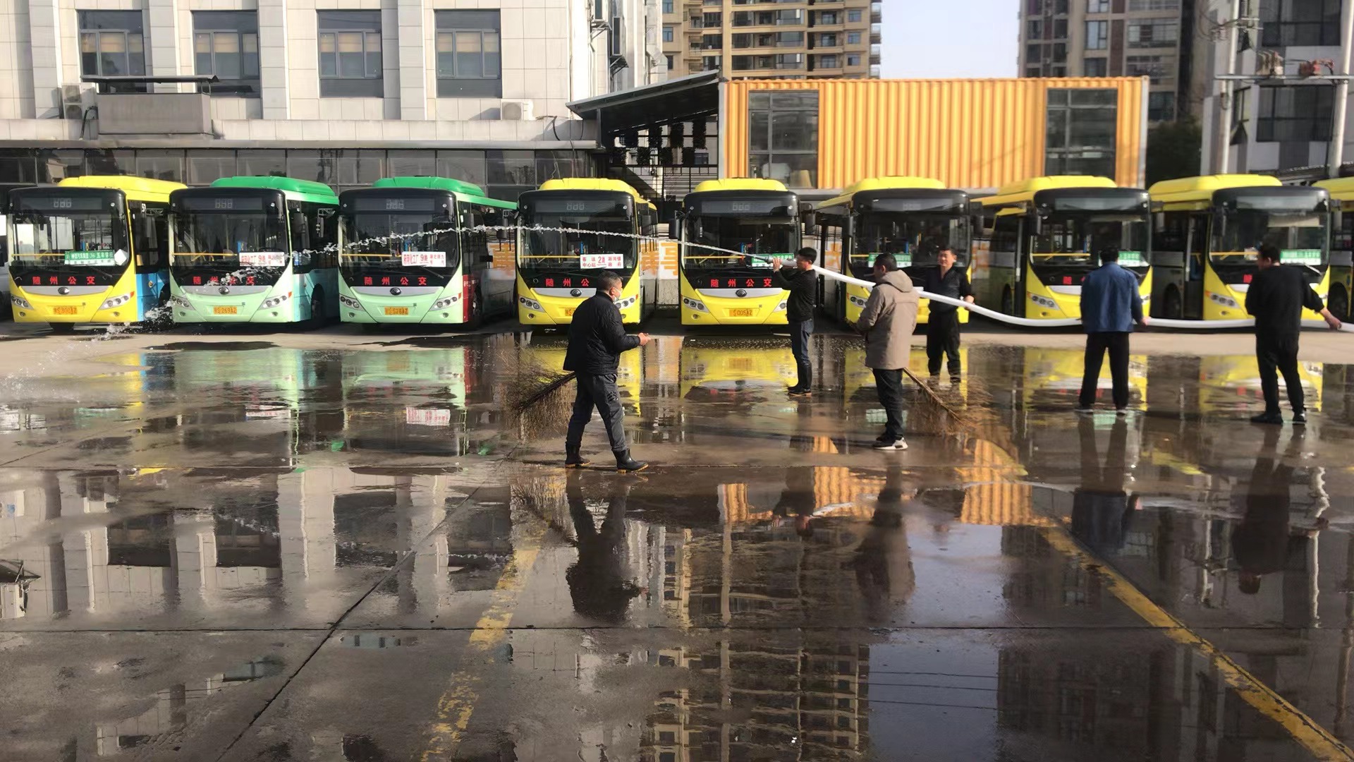 公交公司组织人员对公司大院地面进行冲洗,制作简式公交站牌28块。