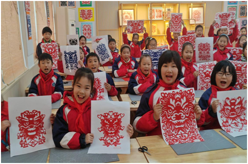 副校长施圆圆是非遗剪纸传承人,主教四年级剪纸课程,同时也是剪纸社团指导老师。她既有精湛的剪纸技艺,又有丰富的教学经验,她以“随州青铜文化”为主题,指导学生进行剪纸学习创作。在她的指导下,思源剪纸社团的队员们,入门迅速,学得兴味盎然。勾底样、学技法,小小的剪刀在他们手中灵活地翻飞,剪出各种精美的纹样和图案后,惊喜闪现在他们的脸上。每次孩子们都舍不得下课。剪纸,带给孩子们满满的成就感。