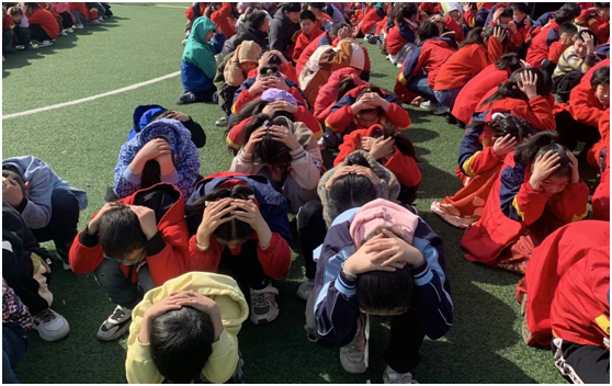 演练开始前,各班学生在班主任的带领下学习避震知识和疏散要领。第一次号令响起,教师指挥学生迅速蹲在课桌下就地避震。第二次号令响起,班主任在前,学生队伍居中,任课老师在后,迅速带领学生撤离到指定安全区域。