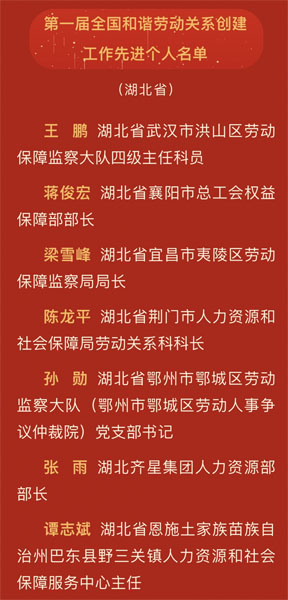 随州新闻网讯 (通讯员梁红玲、徐嫚、翟金凤 )日前, 第一届全国和谐劳动关系创建工作先进集体和先进个人表彰暨经验交流会在北京召开,会议表彰了100个全国和谐劳动关系创建工作先进集体和299名先进个人,由随州市人力资源和社会保障局选树推荐的湖北齐星集团人力资源部部长张雨荣获“全国和谐劳动关系创建工作先进个人”称号。