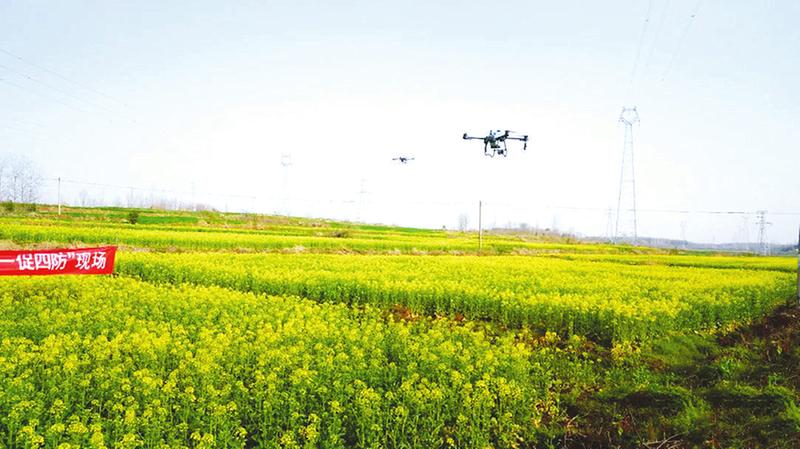 随州日报讯(通讯员王欢)春分已至,农时催人。随县新街镇刘家岗村的油菜地里,一片金黄。在暖阳熙风下,花香浮动,两台无人机正在进行油菜“一促四防”(促进油菜生长发育;防花而不实、防早衰、防菌核病、防高温逼熟)飞防作业。白色雾状药剂从空中倾泻而下,均匀地洒在油菜碧绿的叶片上。螺旋桨转动的“突突突”声,奏响了随县春管春耕“协奏曲”。