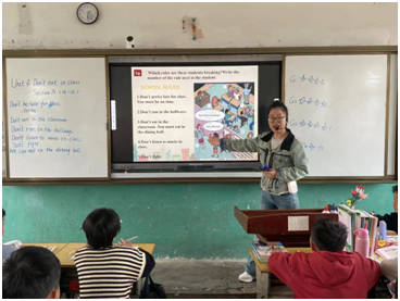 “don’t eat in class!”管梦珠老师的英语课就着教室生活创设情境,让学生将日常同学间的“吐槽”用英语表达出来,从听说读写多角度训练“don’t”句式的运用。