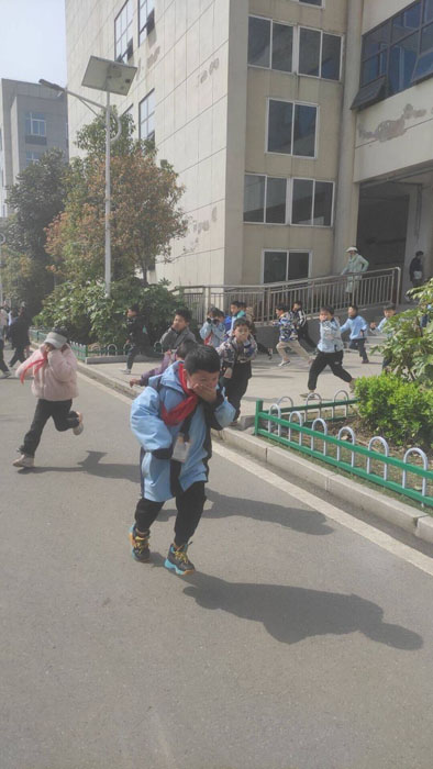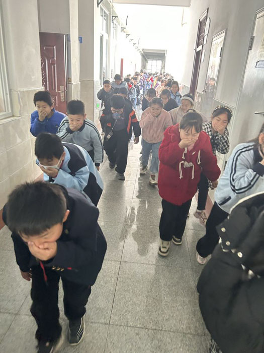 当警报声响起时,各班老师快速反应,引导学生捂住口鼻,低姿弓背,快速有序撤离到教室外。