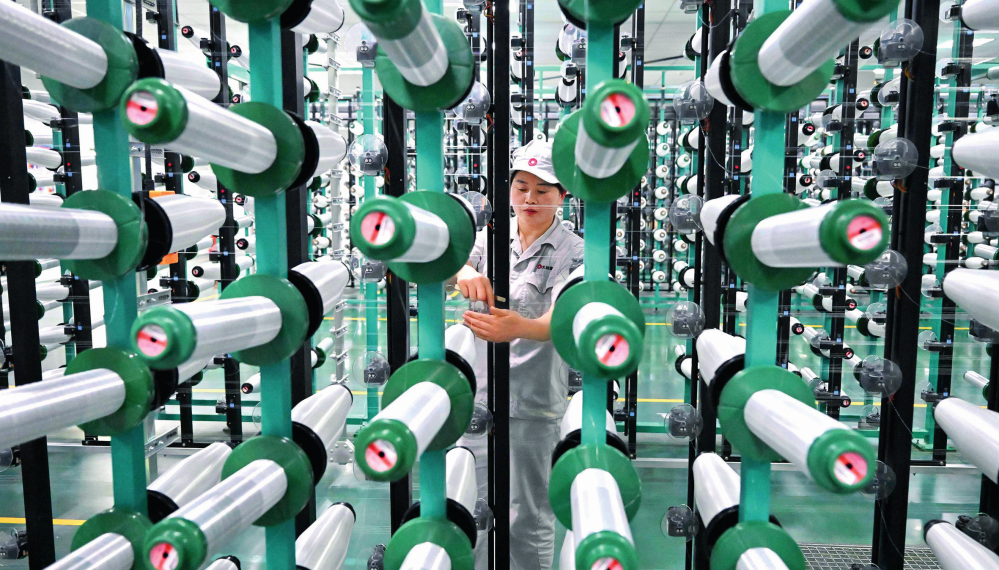 位于河南安阳林州市的河南光远新材料股份有限公司电子布准备车间,工作人员在检查整经机机台(2024 年 3 月6 日摄) 李安摄 / 本刊