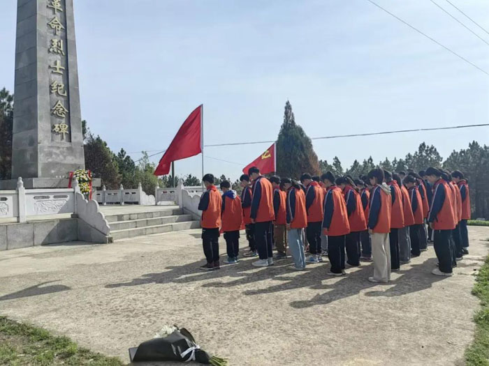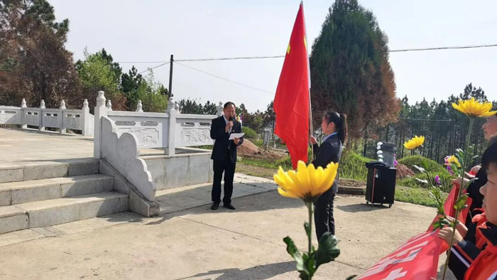松涛阵阵唤英烈,山岗巍巍埋忠骨。活动在低沉的哀乐声中拉开序幕,全体师生向革命烈士纪念碑深深鞠躬,表达对他们的敬意和怀念。面向鲜艳的五星红旗,大家共同唱响义勇军进行曲和少年先锋队队歌。党员代表学校敬献花篮,学校校长段勇上前认真整理缎带。少先队员代表肖雅雯动情发言,表达了对革命先烈的崇敬之情,体现出新时代少先队员继承先烈遗志的决心。学校支部副书记徐敏带领全体党员重温入党誓词。学校少先队辅导员马静老师带领呼号。少先队员们也用自己的行动做了些力所能及的事情,他们打扫陵园卫生,捡拾园内垃圾,让英烈们在青山绿水间长眠安息。