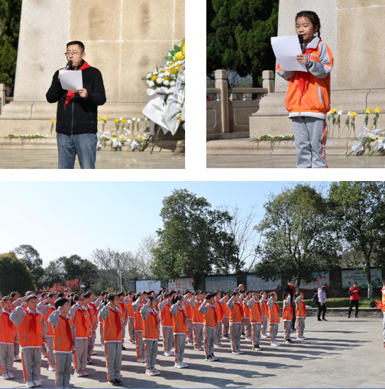 缅怀英烈祭忠魂,抚今追昔思奋进。四(2)中队陈芾垚在革命烈士纪念碑前讲述了革命先辈为新中国的成立浴血奋战的英雄故事,激发了队员们的爱国热情。学校少工委主任江波同志在致辞中讲到“革命先辈用热血铸就了新中国的民族魂,他们是民族的脊梁;科学家用智慧创造了中国奇迹,他们是国家的栋梁;军人用生命捍卫国家尊严,他们是人民的守护神。新时代的少年儿童要学习先辈们崇高的爱国主义精神、顽强不息的拼搏精神和不倦探索的求知精神,时刻践行社会主义核心价值观,好好学习,好好锻炼,立志成材,报效祖国!”队员们在大队长储文轩的带领下重温入队誓词。烈士纪念碑前,“准备着:为共产主义事业贡献力量!”的铮铮誓言久久回荡,这是队员们继承先烈遗志最深情的表达。